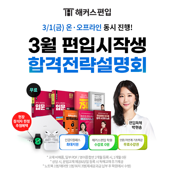 이와 함께 2025학년도 편입 합격에 도움되는 자료집(PDF)도 제공하며, ‘합격전략 설명회’ 현장 참석자에게는 2025 합격비법서(*현장 참석자 비매품 실물교재, 온라인 참석자 PDF 제공), 추첨을 통해 노트북, 에어팟, 워치 등도 제공할 예정이다.