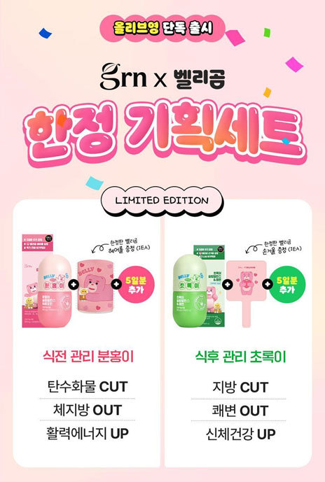 초록이 슬림밸런스 역시 마찬가지로 올리브영 단독 출시로, 벨리곰 리미티드 에디션을 선보인다. 기존 30일분 용량에 추가로 5일분을 더한 이 제품은 벨리곰 손거울이 증정된다. 다이어트 핵심 원료인 '카테킨'과 배변활동을 원활하게 하는 성분이 함유돼 있다.