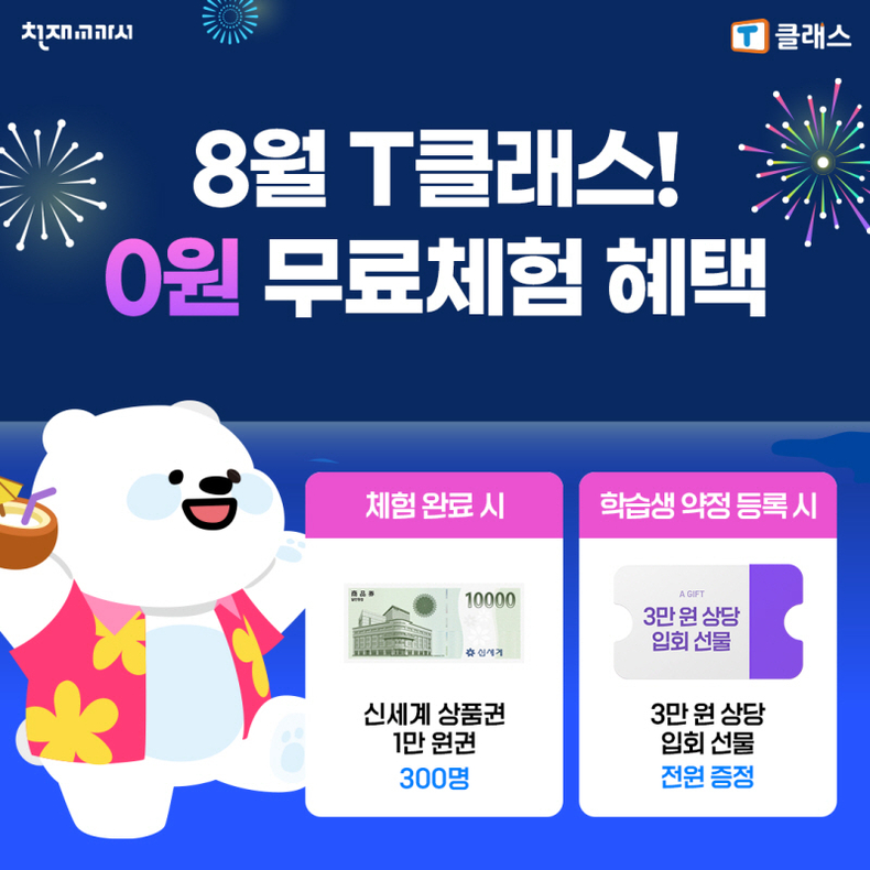 8월 무료 체험을 완료한 선착순 300명에게 신세계 상품권 1만 원권을 제공하며, 무료 체험 이벤트 기간 내 T클래스 학습생 약정 등록 시 입회 선물을 전원 추가 증정한다.