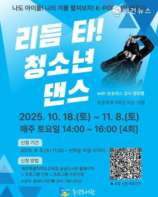 [비건뉴스=최지영 수습기자] 제주도교육청 동녘도서관은 10월 18일부터 오는 11월 8일까지 청소년의 문화·예술 감수성을 키우고 건강한 신체 활동 기회를 제공하기 위해 ‘2025년 리듬 타! 청소년 댄스’를 운영한다