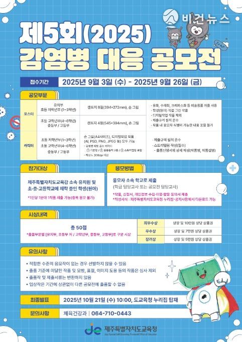 [비건뉴스=최지영 수습기자] 제주특별자치도교육청은 오는 26일까지 학생들이 안전하고 건강한 학교와 사회를 만들 방법을 스스로 생각하고 실천할 수 있는 기회를 제공하기 위해 ‘제5회 감염병 대응 공모전’을 개최한다.