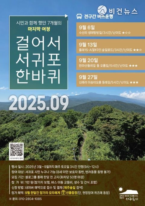 [비건뉴스=최지영 수습기자] 서귀포시는 건강한 걷기문화 확산과 시민 건강증진을 위해 운영 중인 ‘걸어서 서귀포 한바퀴’ 프로그램이 오는 9월 27일 마지막 일정을 앞두고, 누적 1,000여 명이 참여하며 큰 호응을 얻고 있다고 밝혔다.