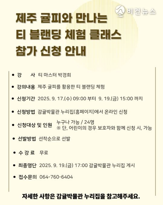 참가 신청은 9월 17일부터 19일 오후 3시까지 감귤박물관 누리집을 통해 선착순 접수하며, 모집 인원은 최대 24명이다. 제주 문화와 치유에 관심 있는 누구나 참여할 수 있으며, 어린이의 경우 보호자 동반 시 신청 참여가 가능하다.