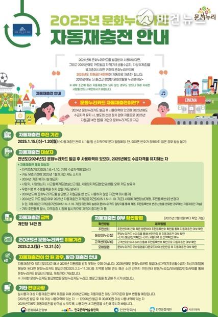 다만 전년도(2024년도) 문화누리카드 지원금을 한 번도 사용하지 않았거나 카드 유효기간이 2025년 1월까지라면 자동재충전 대상자에서 제외된다.