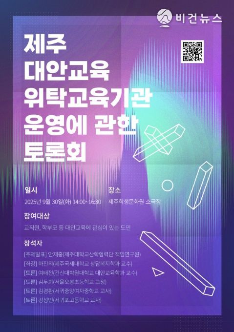 [비건뉴스=최지영 수습기자] 제주특별자치도교육청은 30일 오후 2시 제주학생문화원 소극장에서 연구용역 중간 발표회를 겸한 ‘제주 대안교육 위탁교육기관 운영 방안’ 토론회를 개최한다.