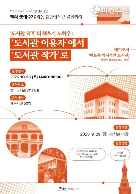[비건뉴스=최지영 수습기자] 제주시 탐라도서관은 제주시민들의 독서 생활을 증진하고 책을 통한 소통의 장을 마련하기 위해 오는 10월 25일 오후 2시 강의실Ⅱ에서 북토리 강연을 개최한다.
