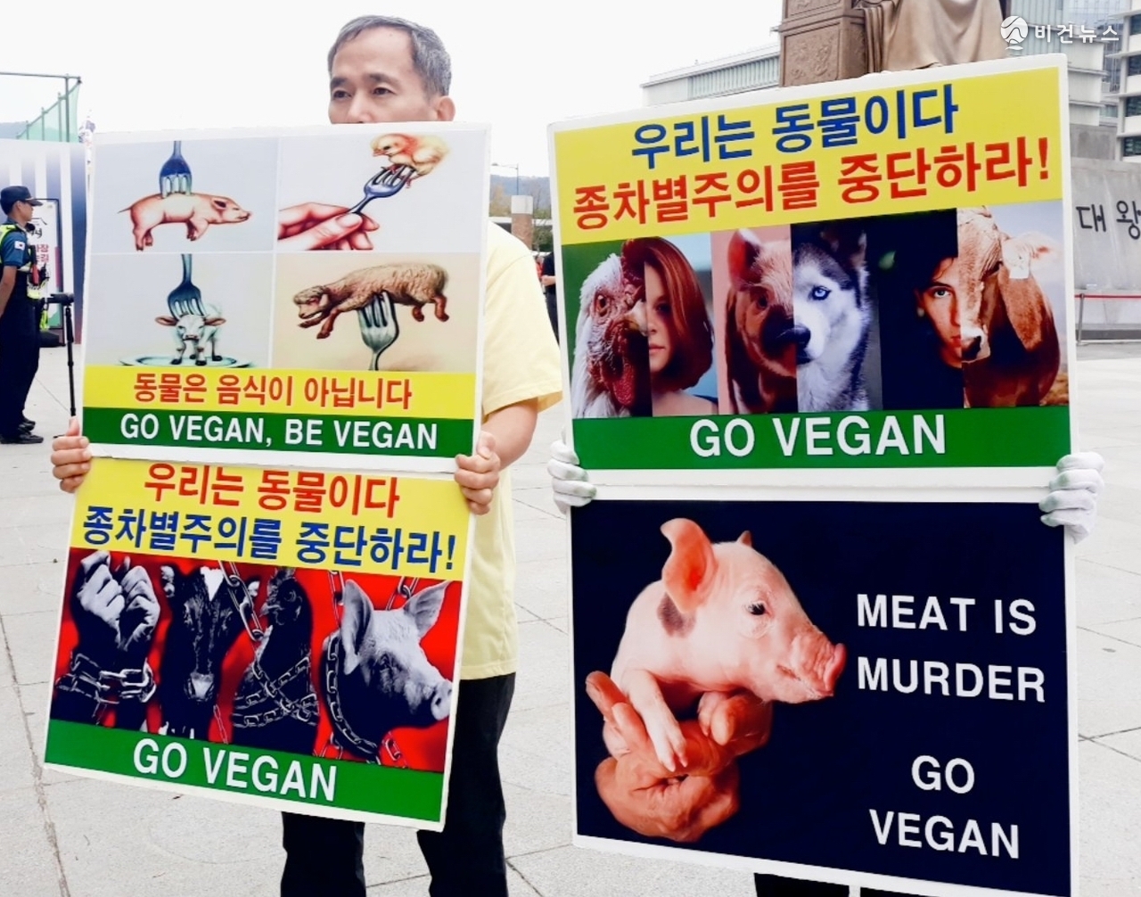 [비건뉴스=서인홍 기자] 한국동물보호연합 회원이 3일 서울 광화문에서 열린 세계 동물의 날 기자회견에서 ‘GO VEGAN’이라고 적힌 피켓을 들고 있다. (사진=한국동물보호연합 제공)