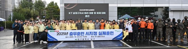 [비건뉴스=최지영 수습기자] 대구 남구는 지난 22일, KT 남대구지사 주차장에서 테러범에 의한 인질극 발생을 가정한 인질 구출, 테러범 진압 훈련 및 드론 테러에 의한 화재발생 시 대피훈련, 화재진압, 복구 작업 등 테러·화재 대비를 주제로 한 『2025 충무훈련 실제훈련』을 실시했다.