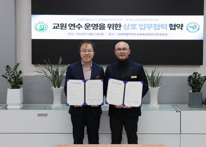 [비건뉴스=최지영 수습기자] 경기도교육청남부연수원이 23일 강원특별자치도교육청교육연수원과 교원 연수 협력을 위한 업무협약(MOU)을 체결했다.