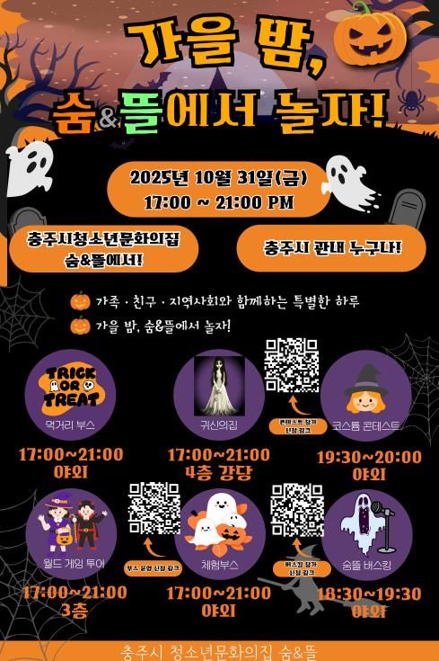 [비건뉴스=최지영 수습기자] 충주시청소년문화의집 숨·뜰에서는 10월 31일 오후 5시부터 9시까지 ‘가을밤, 숨뜰에서 놀자!’ 행사를 진행한다고 밝혔다.