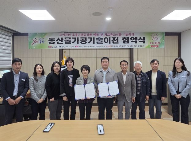 [비건뉴스=최지영 수습기자] 문경시농업기술센터는 10월 24일 농업기술센터 소회의실에서 “오미자, 배, 도라지추출물을 포함하는 호흡기 염증질환 예방 또는 치료용 조성물”(특허번호 제 : 10-2169920호) 특허기술을 관내업체인 “농업회사법인 행복팜(주)”에 이전하는 기술이전 협약식을 체결했다.