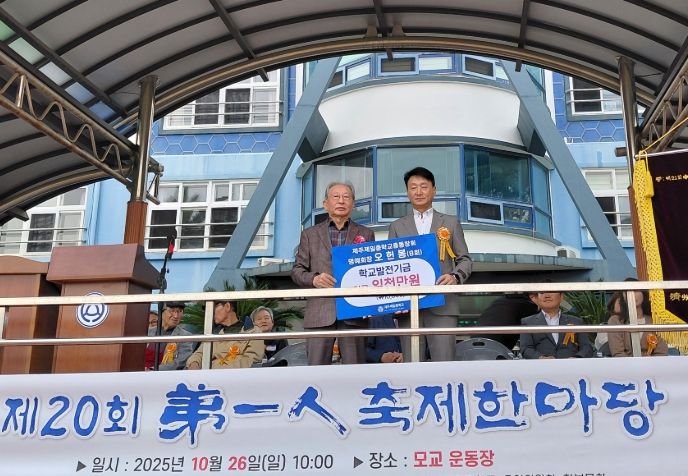 [비건뉴스=최지영 수습기자] 제주도교육청 제주제일중학교는 26일 열린 제20회 제주제일중학교 총동문회‘제일인(弟一人) 축제 한마당’에서 제8회 졸업생 오헌봉 ㈜유성건설 회장이 학교 발전을 위해 2025년부터 2027년까지 3년간 매년 1천만 원씩, 총 3천만 원의 발전기금을 기탁하기로 하고 첫 해분 1천만 원을 전달했다고 밝혔다.