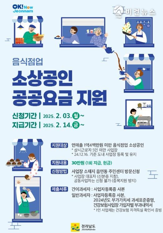 [비건뉴스=최지영 수습기자] 전라남도가 경기 위축과 매출 감소 등으로 경영 위기를 겪는 소규모 음식점업 소상공인 약 2만 개소를 대상으로 공공요금 30만 원을 지원한다.