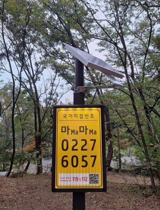 국가지점번호판은 국토 및 해양을 10m 단위 격자형으로 나누어 부여한 국가지점번호를 현장에서 쉽게 식별할 수 있도록 제작된 위치표시 표지판으로, 도로명주소가 없는 산악·하천 지역에서도 긴급상황 발생 시 구조기관의 신속한 위치 확인과 대응을 지원하는 안전 기반 시설물이다.