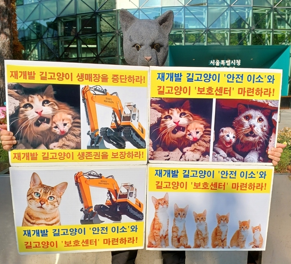 [V포토] 피켓 든 활동가들…“재개발 길고양이 학대 멈춰라”
