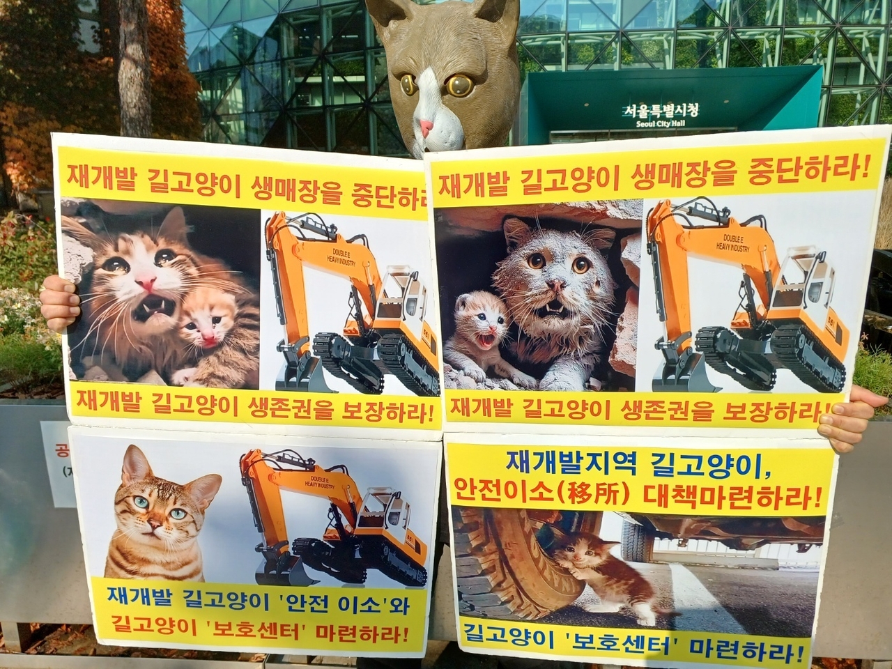 [비건뉴스=최유리 기자] 4일 오후 서울시청 정문 앞에서 한국동물보호연합, 동물의목소리, 동물에게자비를, 동물을위한전진, 카톡동물활동가 등 5개 동물보호단체가 재개발 지역에서 반복되는 길고양이 피해를 막기 위한 기자회견을 열었다. 참가자들은 “재개발 길고양이 생매장을 중단하라”, “우리도 살고 싶다”는 피켓을 들고 생존권 보장과 안전이소 대책 마련을 촉구했다.