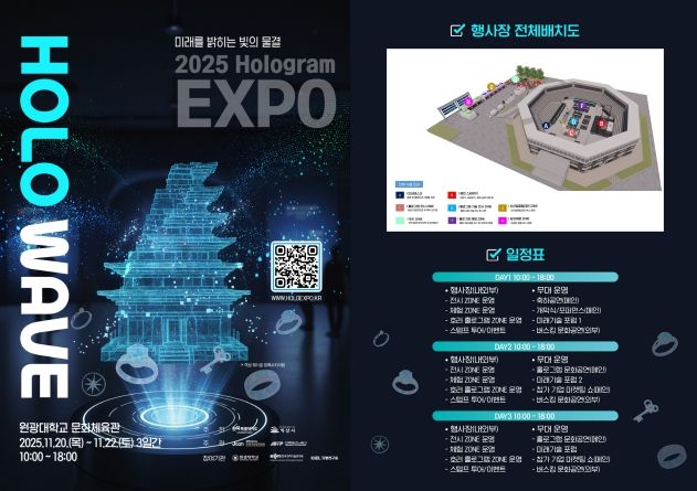[비건뉴스=최지영 수습기자] (재)전북특별자치도 콘텐츠융합진흥원(원장 김성규)은 ‘2025 홀로그램 엑스포 HOLO WAVE’가 오는 11월 20일부터 22일까지 3일간, 오전 10시부터 오후 6시까지 익산 원광대학교 문화체육관에서 개최된다고 밝혔다.