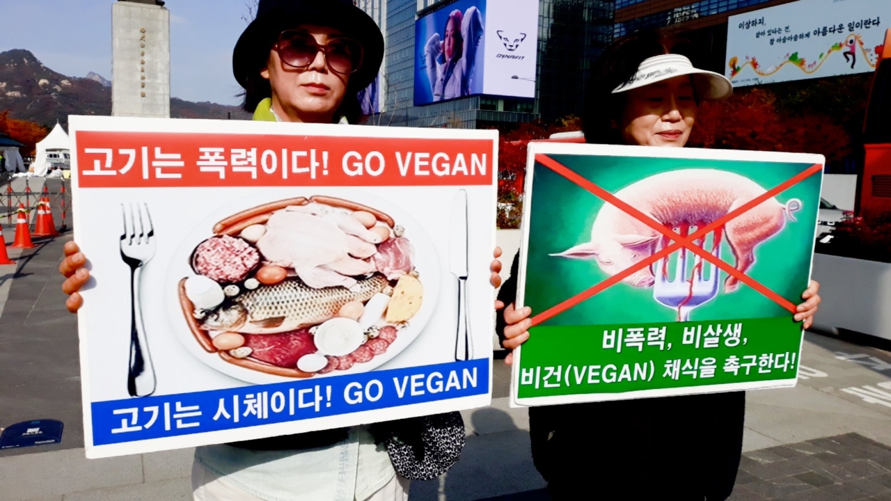 참가자들은 ‘동물억압 중단하라’, ‘Meat is Murder’, ‘Go Vegan!’ 등의 구호를 외치며 피켓과 퍼포먼스로 동물 학대와 착취의 중단, 비건 채식 실천을 촉구했다.