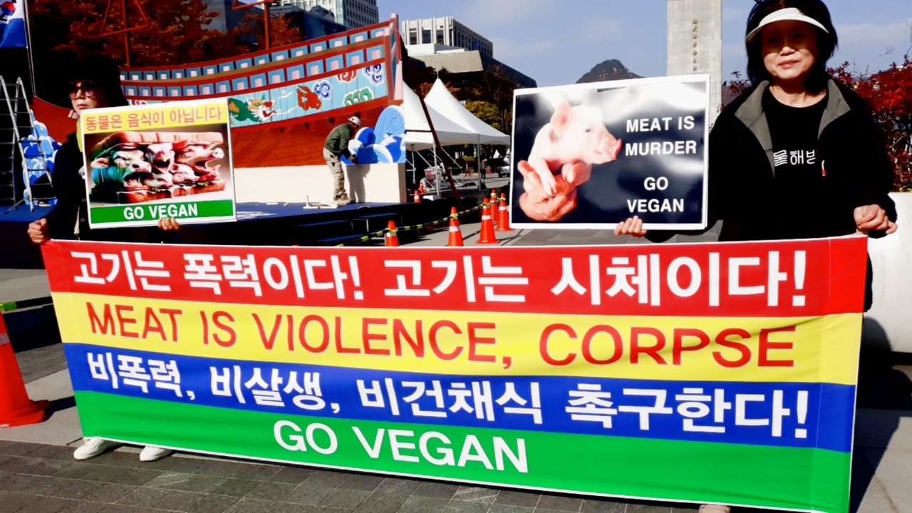 참가자들은 ‘동물억압 중단하라’, ‘Meat is Murder’, ‘Go Vegan!’ 등의 구호를 외치며 피켓과 퍼포먼스로 동물 학대와 착취의 중단, 비건 채식 실천을 촉구했다.