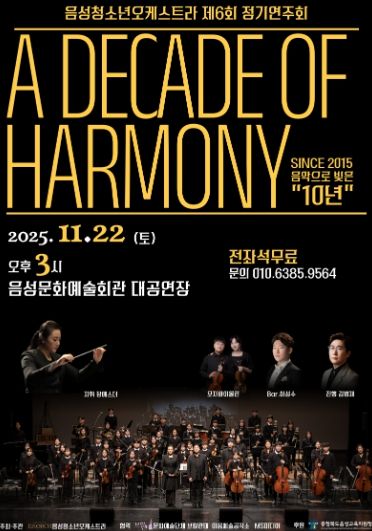 [비건뉴스=최지영 수습기자] 충청북도음성교육지원청의 방과후학교 민간공모사업 운영 단체인 음성청소년오케스트라(지휘 장에스더)가 창단 10주년을 맞이하여 오는 11월 22일 오후 3시, 음성문화예술회관 대공연장에서 제6회 정기연주회 ‘A DECADE OF HARMONY’를 개최한다.