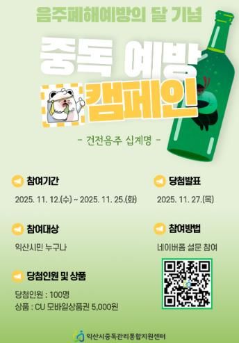 [비건뉴스=최지영 수습기자] 익산시가 11월 '음주폐해 예방의 달'을 맞아 올바른 음주문화 확산에 나선다.