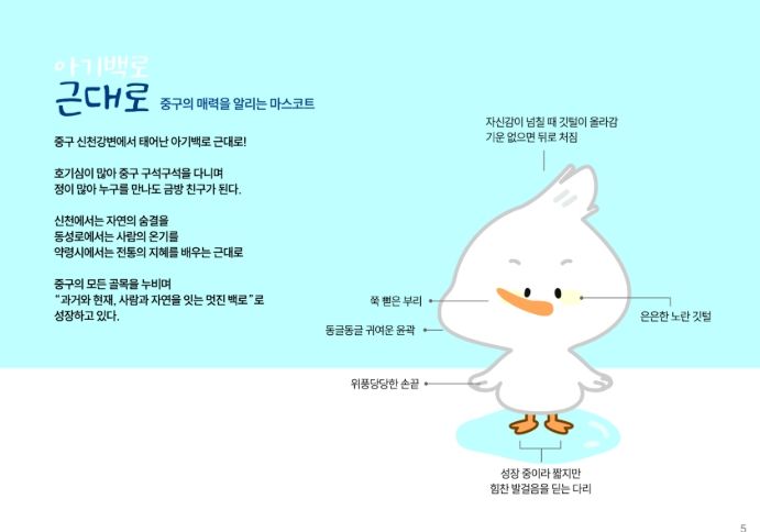 중구청은 지난 10월까지 ‘아기백로 근대로’ 리뉴얼 제작 용역을 통해 기본형 1종, 응용형 27종(축제형·동작형·감정형·SNS형 등)을 완성했으며, 이번 캐릭터는 귀엽고 따뜻한 이미지로 구민에게 친근하게 다가가는 ‘중구의 얼굴’ 역할을 하게 된다.