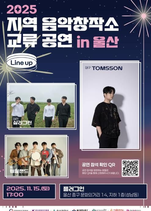 [비건뉴스=최지영 수습기자] 울산 중구문화의전당에서 운영하는 울산음악창작소가 오는 11월 15일, 11월 16일 오후 5시 성남동 플러그인(문화의거리 14)에서 ‘2025 지역 음악창작소 교류 공연 in 울산’을 개최한다.