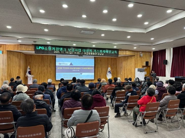 [비건뉴스=최지영 수습기자] 부여군이 전국 최초로 실시한‘가구단위 LPG소형저장탱크 지원사업’ 참여자를 대상으로 여성문화회관 대강당에서 가스 화재 예방 교육을 진행했다고 18일 밝혔다.