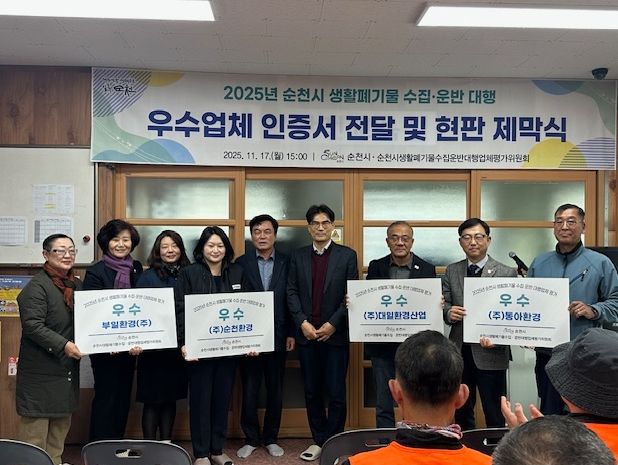 [비건뉴스=최지영 수습기자] 순천시는 지난 17일 (주)대일환경산업 사업장에서 ‘2025년 생활폐기물 수집·운반 대행업체 우수업체 인증서 전달식’과 1위 업체 현판 제막식을 개최했다고 밝혔다.