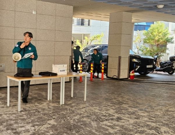 [비건뉴스=최지영 수습기자] 울산 동구 노동자지원센터는 11월 20일 오후 2시 자체 자위소방대원, 전하119안전센터, 교육생 등 30여 명이 참석한 가운데 ‘2025년 공공기관 합동 소방훈련’을 실시했다.