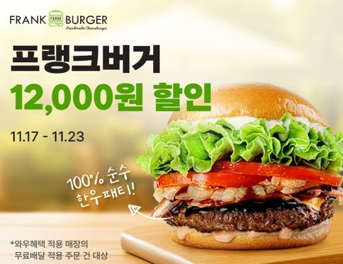 [비건뉴스=김민정 기자] 프랭크버거가 11월 17일부터 23일까지 쿠팡이츠 와우회원 대상 전 메뉴 할인 이벤트를 진행한다고 21일 밝혔다.