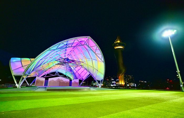 설악산 단풍잎과 속초시 시조인 비둘기를 형상화한 특수제작비닐(ETFE) 재질의 비가림 막구조는 오페라 하우스를 연상시키는 웅장한 분위기를 더한다. 특히, 빛을 머금는 특수제작비닐의 특성이 만들어내는 야간경관은 국화전이 한창인 청초호유원지와 어우러져 가을 야경의 아름다움을 한층 돋보이게 했다.