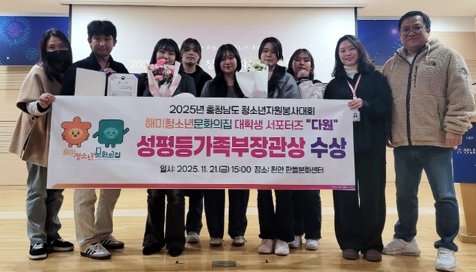 [비건뉴스=최지영 수습기자] 해미청소년문화의집은 지난 21일 성평등가족부와 충청남도가 주최한 2025년 충남청소년자원봉사대회에서 대학생 서포터즈 ‘다원’이 동아리 부문에서 성평등가족부장관상을 수상했다고 밝혔다.