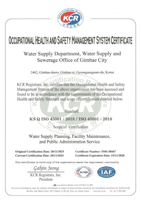 한편 시는 이번 ISO 45001 인증 외에도 상하수도사업소 윤리경영과 준법경영을 실천해 2020년 6월 ISO 37001(부패방지경영시스템) 인증을 취득하고 2023년 6월 갱신 인증받았다.