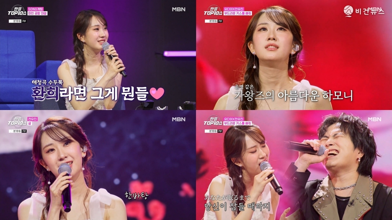[비건뉴스=강진희 기자] 가수 전유진이 지난 25일 밤 서울에서 방송된 MBN 한일톱텐쇼에 출연해 일본 가수 유다이와 첫 듀엣 무대를 펼치며 주목받았다. 이날 방송은 출연자들의 음원 데이터와 음악 성향을 토대로 듀엣 조합을 선정하는 방식으로 꾸려졌다.