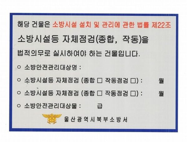 [비건뉴스=최지영 수습기자] 울산 북부소방서는 건물 화재 예방을 위해 소방시설 등의 자체 점검 안내 스티커를 제작해 배부한다고 밝혔다.