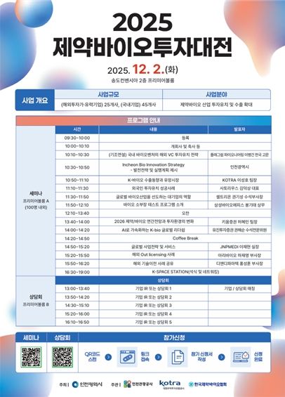[비건뉴스=최지영 수습기자] 인천광역시가 주최하고 인천관광공사와 KOTRA, 한국제약바이오협회가 공동 주관하는 ‘제약바이오투자대전’이 오는 12월 2일 인천 송도컨벤시아 프리미어볼룸에서 열린다.