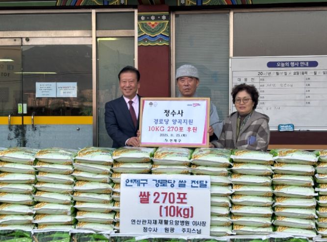 [비건뉴스=최지영 수습기자] 연제구는 11월 25일 정수사(주지 원광스님)로부터 관내 경로당을 위한 양곡 10kg 270포를 기탁 받았다.