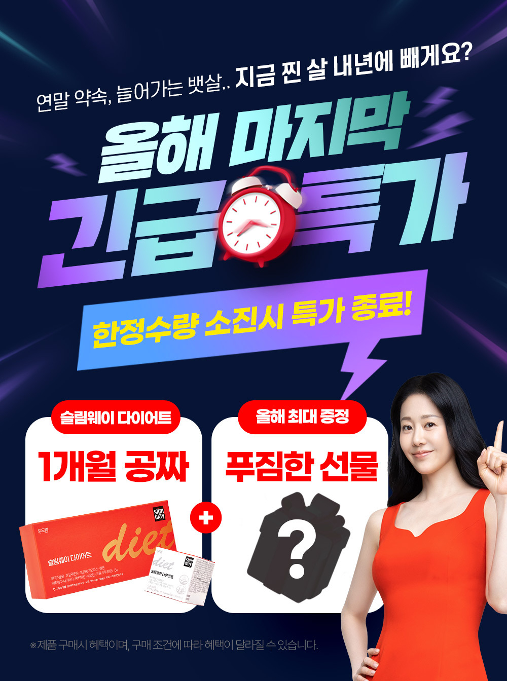 [비건뉴스=김민정 기자] 두드림이 자사 건강기능식품 ‘슬림웨이 다이어트’의 올해 마지막 ‘긴급 특가’ 이벤트를 진행한다고 28일 밝혔다.