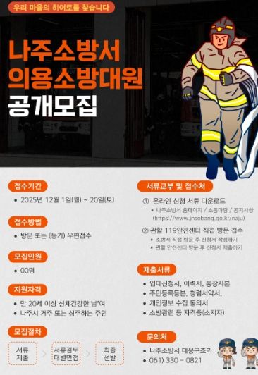 [비건뉴스=최지영 수습기자] 나주소방서는 지역사회의 안전을 책임질 “2025년 하반기 의용소방대 신규대원 모집”에 나선다. 모집 기간은 오는 12월 1일부터 20일까지이며, 신천서류는 나주소방서 홈페이지 또는 나주소방서를 비롯한 119안전센터에서 지원 서류를 배부하고 접수를 진행한다.