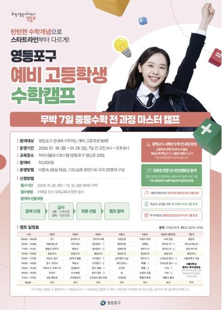 [비건뉴스=최지영 수습기자] 영등포구가 고등학교 진학을 앞둔 관내 중학생을 대상으로 ‘예비 고등학생 수학캠프’를 운영하고, 12월 12일까지 참가자 50명을 모집한다고 밝혔다.