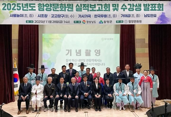 [비건뉴스=최지영 수습기자] 함양문화원은 11월 28일 경상남도와 함양군의 후원으로 ‘2025 문화원 실적보고회 및 수강생 발표회·작품전시회’를 성황리에 마쳤다고 밝혔다.