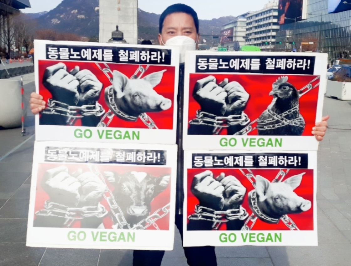 [비건뉴스=최유리 기자] 서울 광화문 이순신 동상 앞에서 12월 2일 ‘국제 노예제 철폐의 날’을 맞아 동물보호단체들이 공장식 축산 중단과 비건 전환을 촉구하는 포토행동을 진행했다. 현장에는 한국동물보호연합, 한국비건채식협회, 기후위기비건행동, 한국비건연대, 한국채식연합이 함께했다. 참가자들은 피켓과 퍼포먼스를 통해 배터리 케이지와 임신틀 등 공장식 사육 구조가 초래하는 문제를 지적하며 동물 억압을 끝내야 한다고 목소리를 냈다.