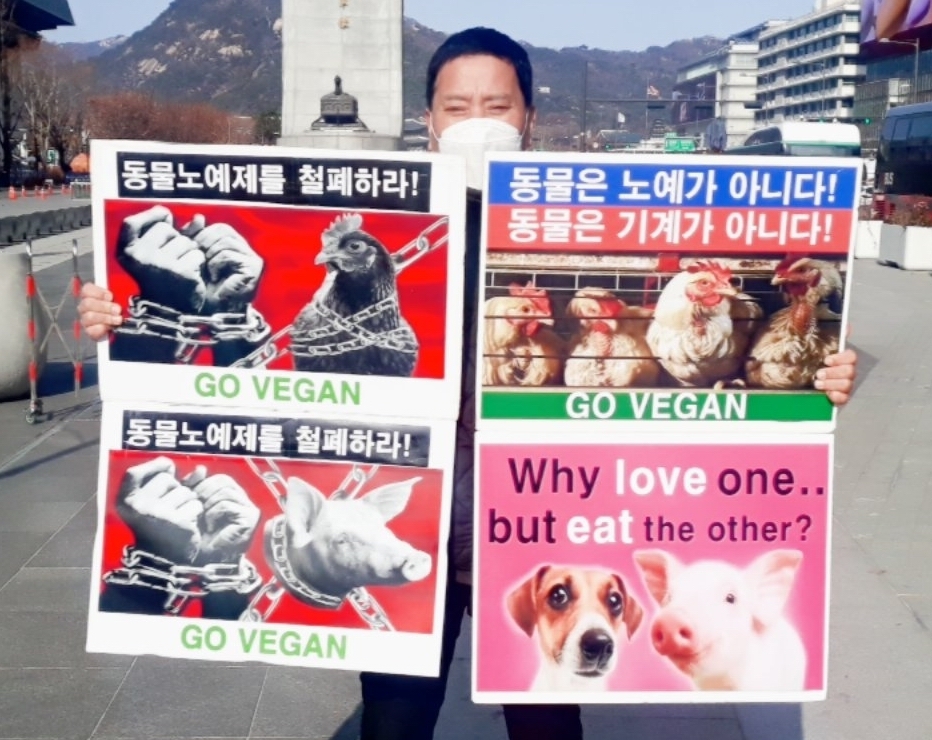 [비건뉴스=최유리 기자] 서울 광화문 이순신 동상 앞에서 12월 2일 ‘국제 노예제 철폐의 날’을 맞아 동물보호단체들이 공장식 축산 중단과 비건 전환을 촉구하는 포토행동을 진행했다. 현장에는 한국동물보호연합, 한국비건채식협회, 기후위기비건행동, 한국비건연대, 한국채식연합이 함께했다. 참가자들은 피켓과 퍼포먼스를 통해 배터리 케이지와 임신틀 등 공장식 사육 구조가 초래하는 문제를 지적하며 동물 억압을 끝내야 한다고 목소리를 냈다.