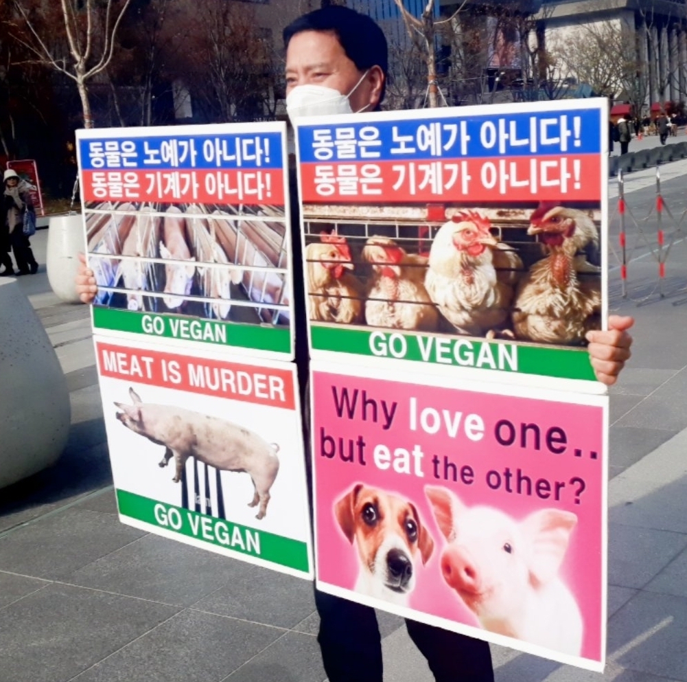 [비건뉴스=최유리 기자] 서울 광화문 이순신 동상 앞에서 12월 2일 ‘국제 노예제 철폐의 날’을 맞아 동물보호단체들이 공장식 축산 중단과 비건 전환을 촉구하는 포토행동을 진행했다. 현장에는 한국동물보호연합, 한국비건채식협회, 기후위기비건행동, 한국비건연대, 한국채식연합이 함께했다. 참가자들은 피켓과 퍼포먼스를 통해 배터리 케이지와 임신틀 등 공장식 사육 구조가 초래하는 문제를 지적하며 동물 억압을 끝내야 한다고 목소리를 냈다.