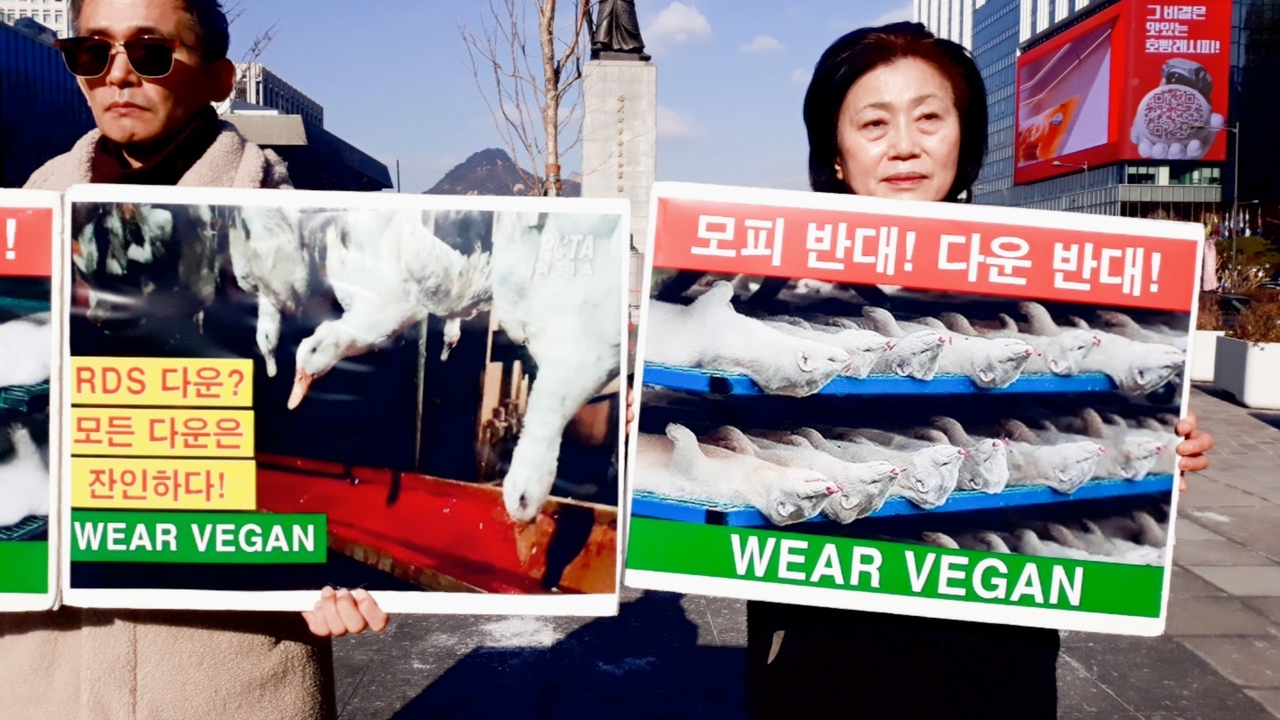 [비건뉴스=최유리 기자] 지난 9일 오후 서울 광화문 이순신동상 앞에서 한국동물보호연합, 동물에게자비를, 한국비건채식협회, 기후위기비건연대, 한국채식연합 등이 공동 기자회견을 열고 모피와 다운 등 동물성 패션 소비 중단을 촉구했다. 참가 단체들은 퍼포먼스와 피켓팅을 진행하며 모피 농장과 다운 채취 과정에서 반복되는 동물학대 실태를 알리고, 동물을 해치지 않는 비건 패션 선택을 시민들에게 호소했다.