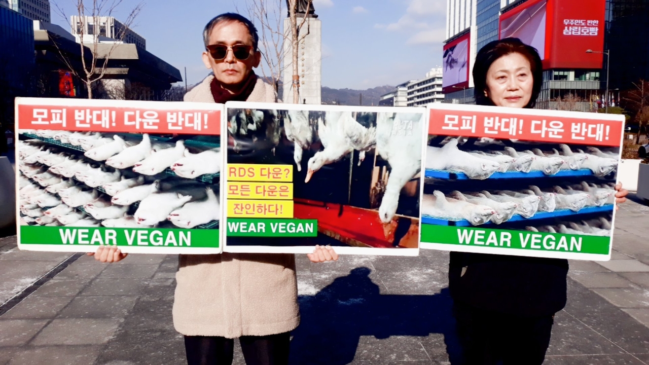 [비건뉴스=최유리 기자] 지난 9일 오후 서울 광화문 이순신동상 앞에서 한국동물보호연합, 동물에게자비를, 한국비건채식협회, 기후위기비건연대, 한국채식연합 등이 공동 기자회견을 열고 모피와 다운 등 동물성 패션 소비 중단을 촉구했다. 참가 단체들은 퍼포먼스와 피켓팅을 진행하며 모피 농장과 다운 채취 과정에서 반복되는 동물학대 실태를 알리고, 동물을 해치지 않는 비건 패션 선택을 시민들에게 호소했다.