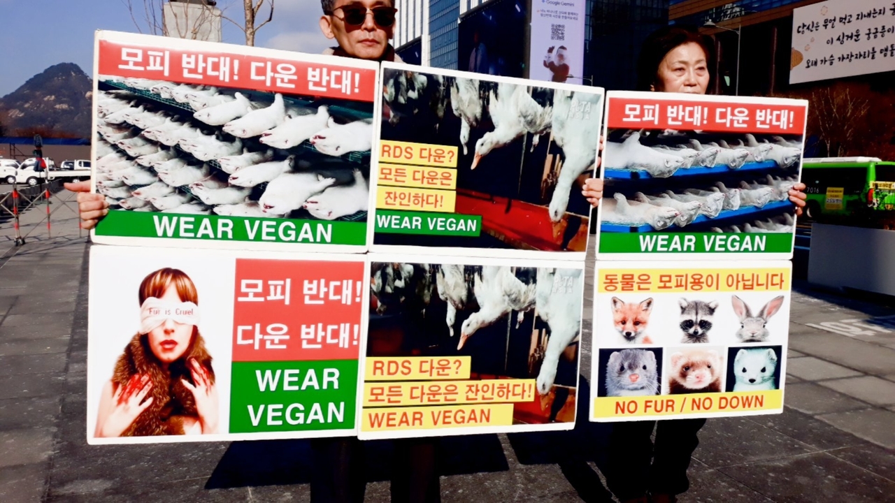 [비건뉴스=최유리 기자] 지난 9일 오후 서울 광화문 이순신동상 앞에서 한국동물보호연합, 동물에게자비를, 한국비건채식협회, 기후위기비건연대, 한국채식연합 등이 공동 기자회견을 열고 모피와 다운 등 동물성 패션 소비 중단을 촉구했다. 참가 단체들은 퍼포먼스와 피켓팅을 진행하며 모피 농장과 다운 채취 과정에서 반복되는 동물학대 실태를 알리고, 동물을 해치지 않는 비건 패션 선택을 시민들에게 호소했다.