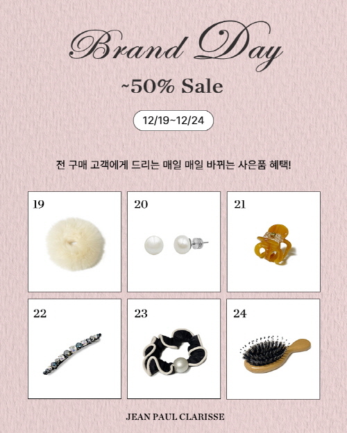 [비건뉴스=김민정 기자] 헤어 액세서리 브랜드 장폴클라리쎄(Jean Paul Clarisse)는 12월 19일부터 24일까지 전국 백화점 매장과 공식 온라인 채널을 통해 연 1회 진행되는 ‘Brand Day’ 프로모션을 운영한다고 19일 밝혔다.