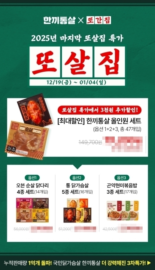 프로모션은 내년 1월 4일까지 진행되며, 인기 제품 3종을 중심으로 최대 51% 할인 혜택을 제공한다. 행사 제품은 매콤갈비찜맛을 포함한 오븐 순살 닭다리 신규 맛 4종 세트, 닭볶음탕맛이 포함된 소스 통 닭가슴살 5종 세트, 해물짬뽕맛이 포함된 곤약현미볶음밥 3종 세트다. 또간집 협업을 기념해 모든 구성 제품을 담은 ‘또살집 스페셜 올인원 세트’ 구매 시에는 추가 3000원 할인 혜택도 제공된다.